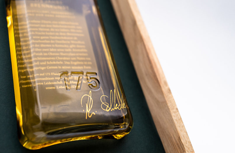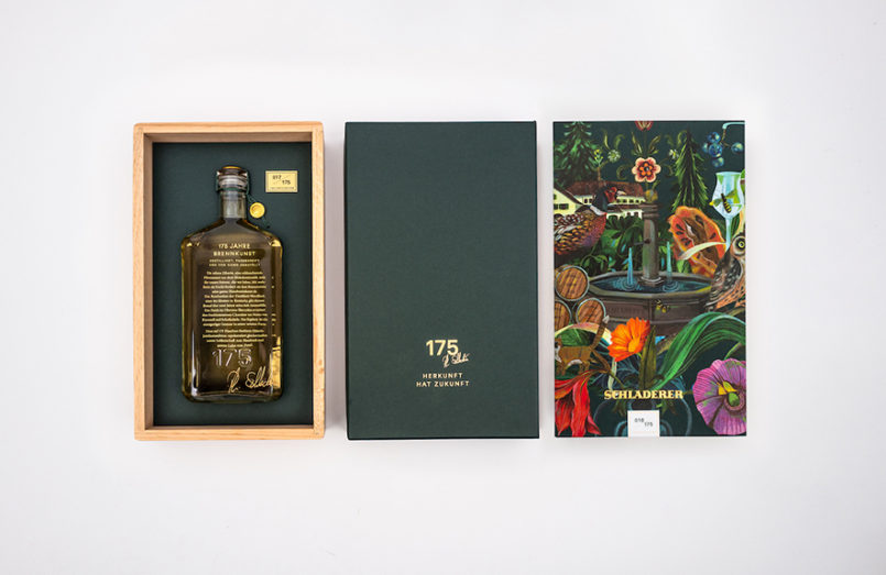 Von der edlen Vierkant-Flasche, über den hochwertigen Eichenholzkarton bis zum Schuber mit dem Jubiläums-Keyvisual präsentiert sich die Verpackung als haptisches und optisches Gesamterlebnis, das die Exklusivität des Inhaltes hervorhebt. Die edle Vierkant-Flasche ist handsigniert und mit einem Goldsiegel verplombt. Die individuelle Editions Nummerierung macht jedes Exemplar zu einem Einzelstück. Sie reist in einer hochwertigen Eichenholzkiste zum Kunden, geschützt durch einen mit einer Collage des Künstlers Olaf Hajek versehenen Schuber. Unsere Schladerer Jubiläumsedition ist für 475,00 € erhältlich. Bestellungen nimmt das Team unter info@schladerer.de oder telefonisch unter +49 7633 832-0 entgegen.