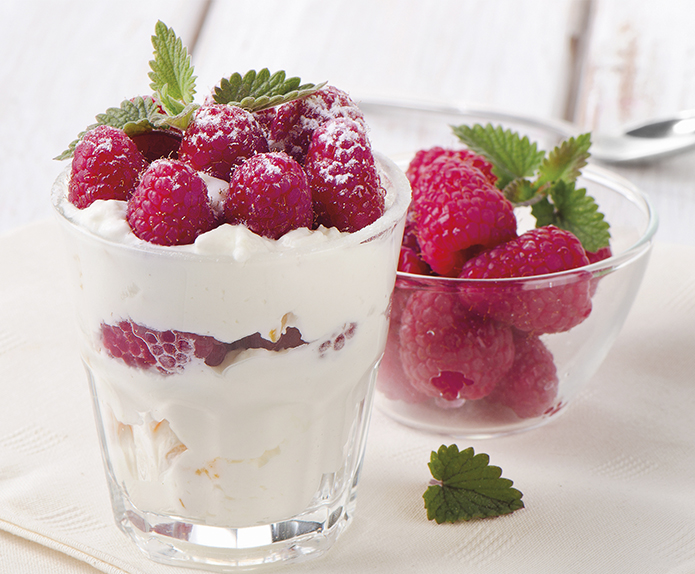 Vor dem Servieren die bereitgelegten Himbeeren auf die oberste Schicht verteilen und dünn mit braunem Zucker bestreuen. Mit zwei Blättern frischer Minze garnieren, servieren und genießen!