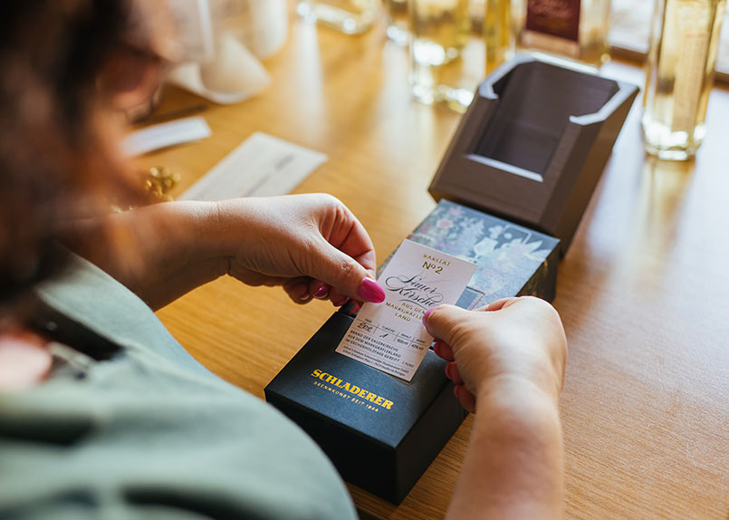 Die SCHLADERER Raritäten werden in einer exklusiven Geschenkpackung angeboten. Dabei wird jede Flasche in Handarbeit abgefüllt und ausgestattet. Welches Fass zur Füllung verwendet wurde ist anhand der Fassnummer auf der Flasche erkennbar. Da es, je nach Beschaffenheit des Holzfasses, vorkommen kann, dass ein Fass mehrmals mit dem gleichen Destillat belegt wird, erhält jede Flasche auch eine Flaschennummer, um damit die Anzahl der Füllung aus diesem Fass nachzuvollziehen.